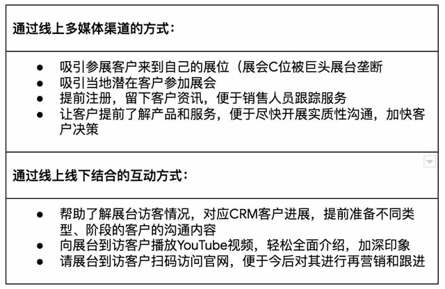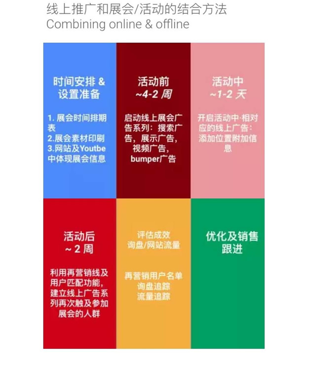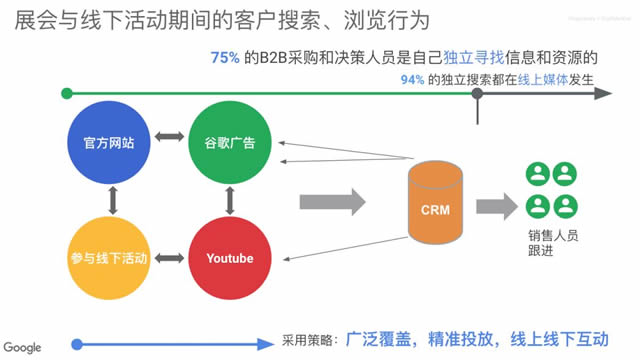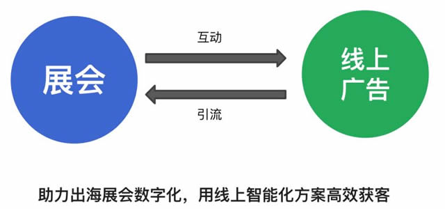 谷歌观点:打通线上线下渠道,线上引流,线下互动 在参展成本日益剧增的情况下,B2B出海企业迫切的需要在线上海投中找到尽可能多的找到精准客源,并在展会上最大化接触潜在客户,深度互动。那么如何做到呢?这里就需要采取线上线下结合的打法。线上引流,线下互动。