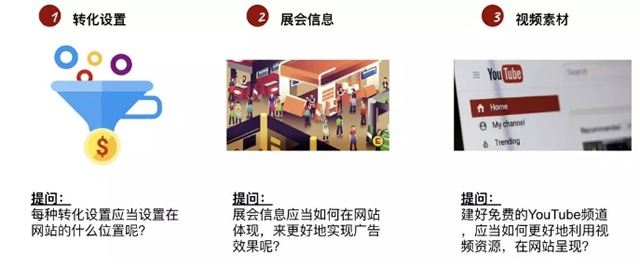 同时,落地页设置和广告与落地页的匹配程度也实际影响着广告的投放效果。网页可转化位置、YouTube 频道利用以及展会落地页设置均能够有效地提升广告 ROI。 注意:转化设置、展会信息和视频素材在网站上如何体现?