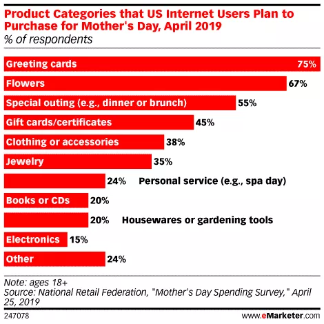 与2019年情人节类似,美国人庆祝母亲节的消费者减少到了84%,2018年为86%。根据NRF的数据,这一节日的平均支出将增加到196美元左右,高于去年(180美元)。 BrandKeys 2019年4月的一项调查发现,消费者计划为母亲节平均支出233美元,比2018年增长4%。 NRF的数据显示,珠宝和特别出游的销售额是过去10年中增长最快的,分别从23亿美元增长到51亿美元和从27亿美元增长到46亿美元。34%的受访者表示,他们有兴趣为今年的母亲节赠送订阅盒子。
