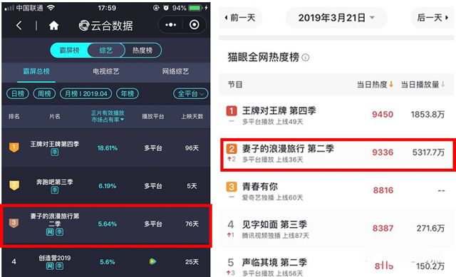 [《妻子2》持续霸榜猫眼、云合综艺热度榜TOP3,成观察类综艺TOP1]
