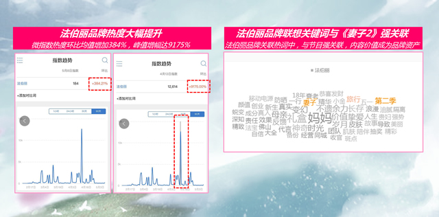 通过如此面面俱到的营销模式,法伯丽的品牌影响力都随着节目的热播得到有效提升。节目受众80%为熟龄女性,且主要来自北、上、江浙等一线城市,精准渗透到目标高端女性群体。其次花絮帖曝光完成率达200%,强曝光有效提升品牌知名度。“法伯丽”品牌关联微指数呈现多个小高峰,热播期间平均微指数增幅超384%,数峰值更达9135%,实现品牌热度全面提升。