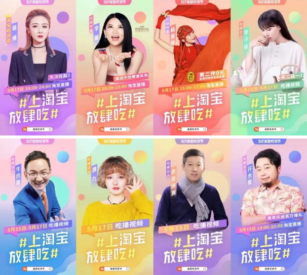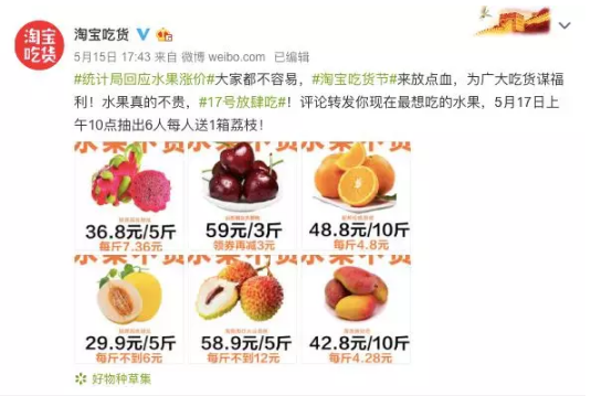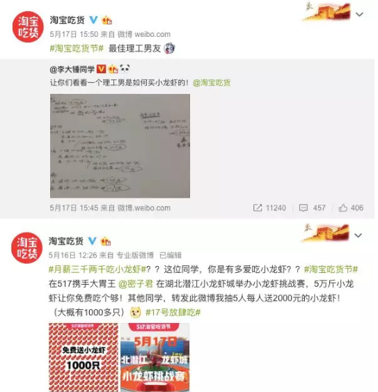 小镇青年们除了在线上看直播和短视频,也注重身边的氛围。这次淘宝吃货节也在线下气氛这部分上下了功夫。它与超过100个产业基地、4000多个品牌及多家美食餐厅合作,制作了517淘宝吃货节的相关广告并进行了最大化的曝光。同时在线下包场了2大美食地标:西安回民街和湖北小龙虾城,并设置了互动环节及PGC挑战赛,让吃货节的气氛更直接的传递给了消费者。 在微博端,淘宝也迎合下沉市场中消费者的social行为及偏好,打造了多个吸引小镇青年的话题热潮,比如:借势#统计局回应水果涨价#热门话题而发布的#水果不贵#爆款海报、打造了#理工男如何花小钱#、#月薪3000花2000吃下龙虾#、#洗衣机小龙虾#等热点话题,这波操作使主话题#淘宝吃货节#阅读量过4亿,讨论量超过20万、话题#17号放肆吃#阅读量破2亿,成功杀入微博话题TOP总榜。