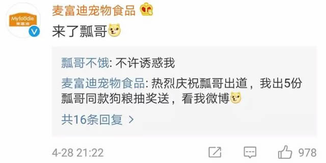 在最新一季的节目中,麦富迪狗粮依旧以自然植入的身份赞助了《向往的生活》,而且取得不俗的广告效应。 尤其是在这一季刚开始的时候,蘑菇屋四子锅碗瓢盆抢食的片段,将广告宣传做得深入骨髓,这一片段后来在经过微博发酵后,不仅登上了微博热搜榜,而且还助力节目成为当周短视频播放量的TOP1。 同时,在节目中因疯狂抢食而闻名遐迩的瓢哥,也因此能够率先出道,在其单独的微博账号中,与广告商金主“麦富迪宠物食品”互动频繁,效应不俗。