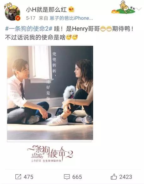 此外,前几天,由刘宪华主演的电影《一条狗的使命2》上映,在小H的微博中,更是直接为电影宣传,还幽默地提问:“话说我的使命是啥?”随后,刘宪华也在微博中回复:“小H,你要乖。”小互动的背后,也为电影增加了一些热度。