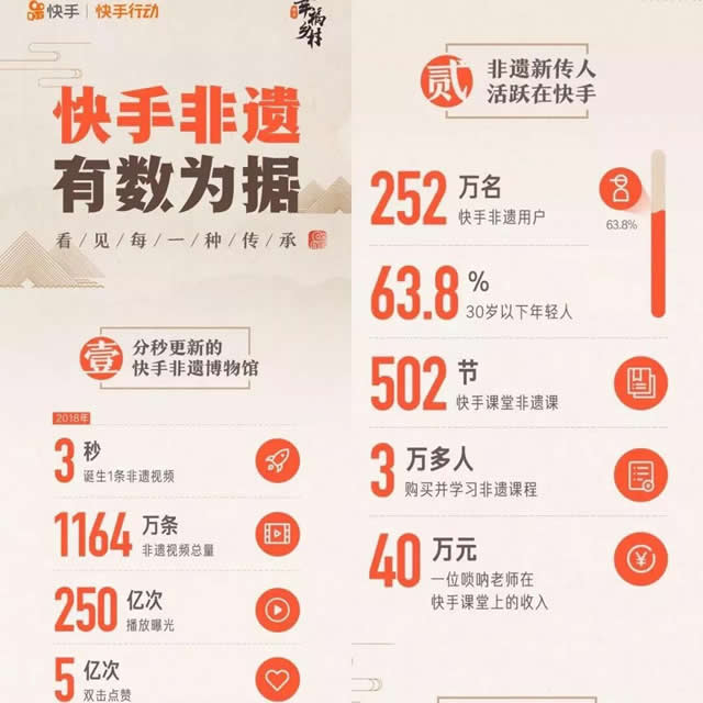像张永杰这样的非遗传承人还有很多。他们坚守在非遗的传承上,却苦于不会宣传,也不懂推广。进入更加年轻的人群,融入现代生活,成为非遗手艺人的普遍诉求。 而大众对非遗并非没有需求,随着经济的发展,年轻一代也在寻求类似古风歌曲这样本土化的文化表达。久蒙尘垢的非遗文化,也正需要合适的介质,来对接年轻一代的需求。有着强大生命力的短视频,让非遗焕发了新的生机。 快手于今年3月发布的非遗长图数据报告显示,在1372项国家级非遗项目中,快手上涉及的非遗项目多达989项,比例达72%。在过去的一年里,快手上累计出现1164万条非遗视频内容,共获得超过250亿次播放和5亿次点赞。