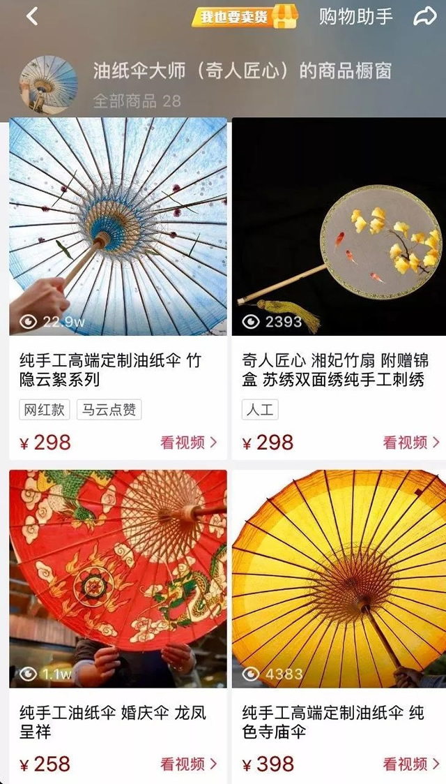 据抖音公布的数据,截止4月,在我国1372项国家级非遗代表项目中有1214项在抖音上有相关内容的传播,共产生了超过2400万条视频和超过1065亿次播放。 而抖音、快手之所以赋能非遗文化,与平台上活跃而丰富的非遗生态,以及现实中非遗传承面临着后继无人的“断代”危机和来自市场的巨大挑战后有着密切的关系。 从传播到变现,非遗商业价值的多种可能性 短视频平台为非遗文化的传播提供了一个巨大的窗口。然而,单纯内容层面上的传播并不足以支撑非遗文化的传承。如同众多MCN、内容创作者一样,借助短视频平台输出优质内容的同时,终极目标必然是商业价值的转化。对于目前面临着商业困境的非遗传承人来说,只有通过较为完整、成熟的产业链条,完成非遗的商业变现,才能使其存活,并得以传承。 余万伦的手工油纸伞制作工序多达96道,精细的工艺和耗费的制作时长决定了其在价格上的相对高昂,这也使得成品油纸伞的市场十分有限。大部分时候, 都是忠实粉丝在进行购买。也正因此,在进驻抖音之前,对于在杭州工艺美术博物馆等开设工作坊、为学校企业开设体验课程的余万伦而言,成品伞的售卖并不是其主要的收入来源,