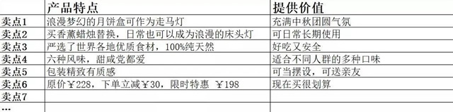 我们都知道爱奇艺奇麟神算广告账户优化主要分四步:选卖点、写创意、做配图、制作营销页。 对于高手而言,这四步都有一些技巧和工具去赋能,让这四步所达到的效果更好。 来,今天就向大家分享下在爱奇艺广告优化师在做账户优化这四步时所用到的工具和技巧。 选卖点 卖点是一条文案的精髓,是写作的依据。那么,选择卖点就变得尤为重要。 在选择卖点时,我们要谨记一个公式:产品卖点=产品特点+可提供的价值。 以“月饼礼盒”为例。 首先第一步,你可以做一个表格,如下图所示: