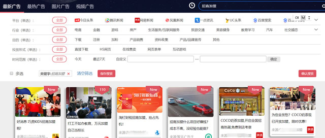 填完这个表格后,你就提取出了产品的全部卖点。 但卖点这么多,我们不可能全部写上去,这就需要进行筛选卖点。在筛选时,我们可遵循两项原则: 1) 这个卖点能否满足目标人群的需求——能满足需求就是好卖点,能满足主要需求更是好卖点。 2) 这个卖点会不会与竞品雷同——与竞品不雷同的就是好卖点。 写创意 创意可能是所有优化师最痛苦的一个优化点。 其实随着科技的发展,你可以通过科技去查看到全网的广告创意,去找转化率最好、点击率最高,依据它们的特性进行撰写。 关于写创意,在这主要推荐两个工具: 1. 信息流雷达 你可以根据自身行业,搜索到全网的广告创意,并根据自身投放的平台、转化方式等来缩小创意选择范围,以此让自身创意更有针对性。