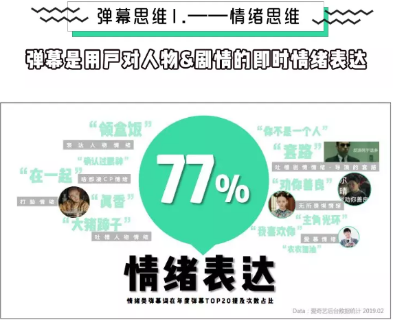 通过分析2018爱奇艺年度弹幕热词占比发现,77%的弹幕词条都反映了——观众对视频内剧情或人物的情绪表达,如“套路”“真香”“大猪蹄子”“劝你善良”等等。弹幕成为年轻视频用户抒发情绪的最直接社交场景。