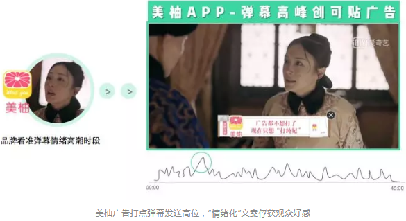 从爱奇艺剧集弹幕曲线显示,每当出现观众出对人物或剧情“爱恨情仇”的情绪表达高潮——弹幕高峰时段,品牌广告如果跟随高能剧情点,以“情绪化表达”的广告文案第一时间占领观众视线,将获得更多的品牌好感与观众情感认同。目前,爱奇艺通过AI智能系统,可以实现智能筛选弹幕发送高峰时段,为品牌提供更精准的广告营销黄金“情绪点位”。