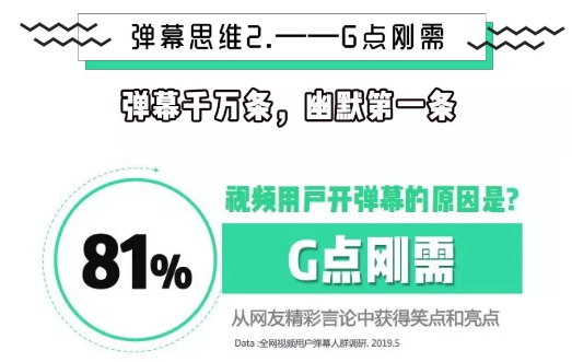 根据全网视频弹幕用户调研显示,弹幕是众多用户观看视频过程的欢乐源泉。81%的网民开弹幕,是为了从网友精彩评论中获得更多笑点和亮点。因此,弹幕成为观众对内容G点的最大刚性需求。