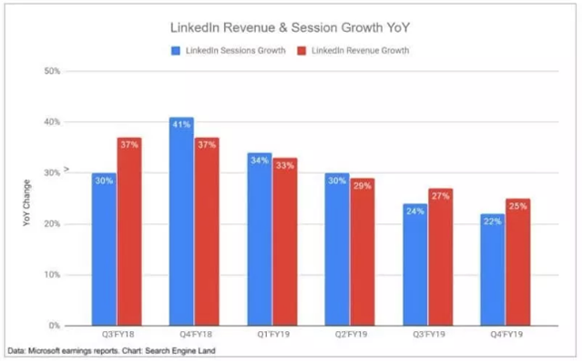 eMarketer 预测2019数字广告市场份额图 在此之前,微软广告主要分为搜索和领英两块业务,搜索广告除了必应还有Microsoft Audience Network中的Outlook、MSN.com等平台。而领英于2016年被微软收购,并进一步发展广告业务。微软曾多次表示领英上用户的参与度一直在不断突破原有记录,78% B2B营销人员评价领英为最有效的社交平台。对于一些想要触达决策层人群的企业来说,领英是绝佳的渠道。 然而在收入上,微软的广告业务却不太理想,这也是微软想在电商行业寻求增长的原因之一。 在2019财年(截止到6月30日),微软的搜索广告业务收入76亿美元,比去年增长了6亿美元。但在第二季度(财年第四季度)财报中,微软的两块广告业务——领英和搜索的同比增长却显下降,其中搜索广告业务只增长了9%,而领英收入虽然还维持两位数增长(22%),但已经连续几个季度都在放缓。