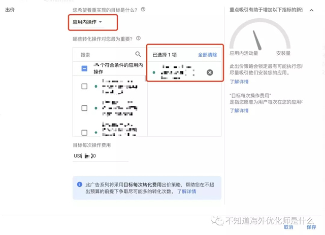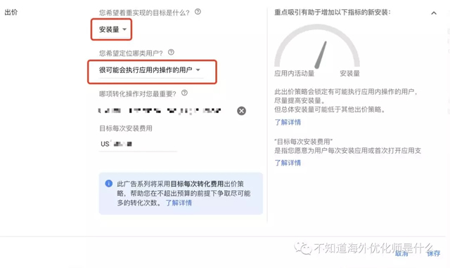 *图为UAC2.5系列设置 知道了Google UAC三种基本模式,基本就可以根据自己的产品需求来选择不同的系列类型进行优化了。 需要量大便宜安装的,UAC1.0优先;2.0的应用场景较少,效果对于事件优化来说也并没有2.5明显,目前不推荐大量使用;需要获取付费用户或者留存提高等应用内事件的,建议还是以UAC2.5优先。后面将会讲到如何衡量UAC 2.5预算与出价的合理性。