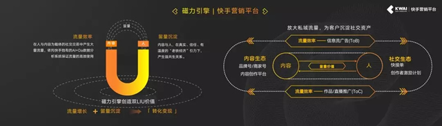 快手磁力引擎 当下,自媒体短视频虽正值热潮,但受众和行业对内容质量的要求越来越高,粉丝增长与流量变现变得困难。在私域流量的加持之下,快手将最大限度实现内容生产者的商业收益,此举无疑引领短视频市场新一轮的爆发机会。 而对快手而言,这只是开启私域流量市场的第一步。接下来,快手将进一步探索商业的边界,持续通过“私域+公域”流量的双重变现路径深挖商业生态“富矿”。