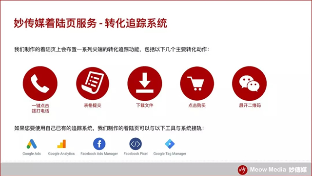 2、着陆页的转化功能与追踪系统 作为一个单页型网站,着陆页的内容必须紧凑 (不讲一句废话新春营销),每个板块都为了说服这个用户而存在。从产品/服务介绍,市场优势,公司资质到用户好评,各个板块之间要层层递进,让用户对商家产生信任,对产品/服务的需求感加重。 用一句浅显的话说,着陆页的内容设计就是要制造出一种让用户觉得“过了这个村,就没了这个店”的体验,去除他们的疑虑,让用户实现当页转化。 谷歌广告的优化其实一部分也是对着陆页的优化。着陆页诞生后不是一尘不变的,小红书品牌号申请它必须随着谷歌广告的更新一起演变,才能保证关键字的高度相关。关于这一点,妙传媒公众号(ID: MeowMedia)之前发布过一篇专门讲优化的文章,大家可以在这篇文章底部的快捷书签里点击查阅。 着陆页还必须要有的元素,就是嵌入转化设施。比如拨打电话,提交表格或扫二维码等等。这些转化动作,根据商家的需求,都可以在着陆页上实现。在选择转化类型的时候,商家不仅需要考虑能配合自己销售流程的设施,还要考虑到用户特征。比如华人客群普遍来说更愿意用微信联络商家,而不是发邮件。 转化设施嵌入了着陆页之后,还要记得安装转化追踪功能。以下是妙传媒提供的着陆页服务中,所包含的几个基本转化追踪类型和系统工具。