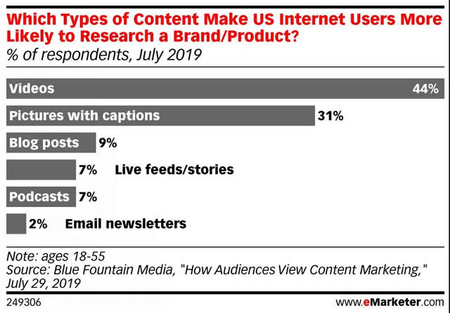 图片来源:eMarketer 而且,视频会比其他形式的内容更能促使消费者产生进一步了解你的产品的欲望,正如下图 Blue Fountain Media 在2019年7月的调研数据所示。