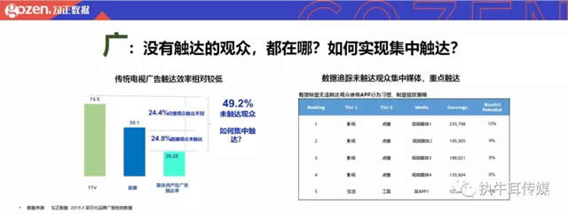 除了广告触达以外,精准用户画像也是勾正数据产品的成功落地之一。通过CHMP系统数据,可以进行人群行为的洞察。CHMP的人群洞察版块可以准确勾勒出广告已经触达到的人群画像。包括:性别、年龄、收入、品牌分布、家庭结构分布、地域属性、城市级别等信息,都可以精准呈现,有助于广告投放的透明、清晰和投放效果的可追踪。 深耕营销领域,打造行业品牌 勾正数据(GozenData)是一家致力于家庭数据智能营销的第三方大数据公司,也是中国第一家以家庭数据为核心的大数据驱动家庭场景营销的企业。“科技是第一生产力”,这一真理是勾正数据开拓行业领域的宗旨,公司拥有先进的数据采集技术、海量的智能电视终端及成熟的数据分析能力。截至2019H1,勾正数据(GozenData)已联合拥有智能电视终端超过1.26亿台,OTT BOX 覆盖3000万台,有效覆盖1.4亿家庭,3.6亿人口。数据覆盖规模和挖掘深度两个方面都居于行业领先地位。勾正数据的产品包括(ORS、CHMPP)在内,已经形成了包括:投前洞察、投中优化和投后效果评估在内的数据闭环分析系统,提供以家庭智慧屏为核心的全链路大数据营销方案,协助广告公司制定差异化媒体营销策略,提升广告投放效果。 跨屏连接、广泛触达、精准定位,为广告主创造核心价值 在没有家庭智慧屏之前,用户和媒体之间是“多对一”的现状联系。每位用户和媒体相关联,用户之间相互隔绝,媒体之间也没有一个稳定的数据共享渠道。那时候数据是缺乏关联的。而现在勾正数据能够实现整个家庭的跨屏连接,解决了行业的一个难题。勾正数据的主要应用场景主要有几种:第一是大小屏联动之后的后链路效果验证。勾正和唯品会合作的一个项目,让唯品会在OTT的开机广告上找到相关联的手机,再把这个手机信息反馈给唯品会。这样,用户就可以看到OTT的广告,这对广告主的KPI会产生正向效果,这就是后链路的效果。第二是广告跨屏的Reach优化。让广告主了解到品牌在电视端和跨媒体端曝光后的总体触达率。第三是勾正数据可以支持客户的跨屏广告投放的策划。从媒体分配、内容的分配和资源分配方面都能给与有效的数据支撑和资源的匹配。