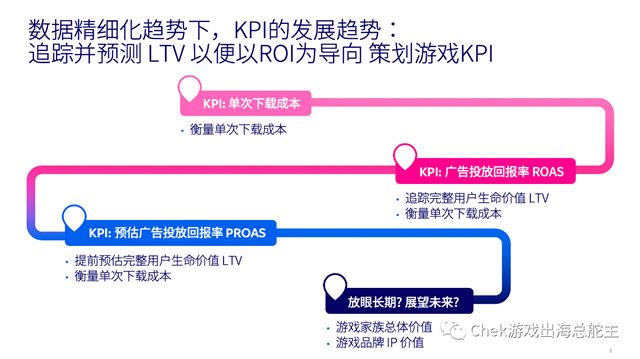 今天舵主我打算掏心掏肺,和大家一起聊聊,那些年,我们一起追过的女孩KPI,当然也会送上干货指南,教小伙伴们合理制定影响游戏广告投放的几大KPI,包括LTV及下载量等,从此妈妈再也不用担心我们追错KPI啦! 当我们在聊 KPI 时,我们在聊什么 为实现可持续增长,影响手游投放的KPI,已从以往的下载量、点击量、单次安装费用(CPI)这些“简单粗暴”的数字,不断往与变现更为密切相关的用户终身价值(LTV)及广告花费回报(ROAS)等靠拢。