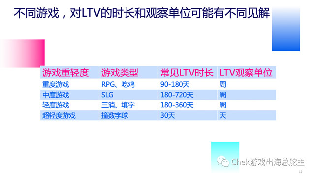 不同的游戏类型,LTV涉及的时长和观察单位也有所不同,可以根据游戏的轻重度进行大致分类。