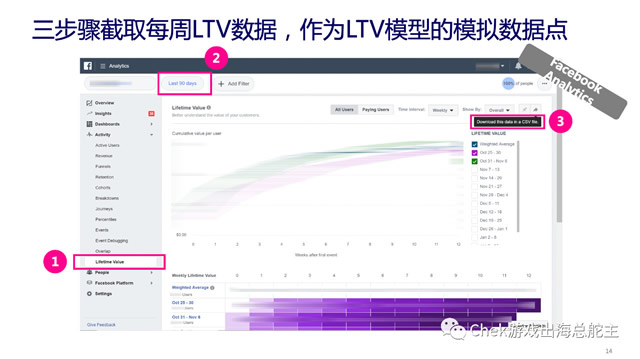 只要你接入了Facebook的SDK数据(即安装了应用事件付费点),便能在Facebook Analytics的后台通过lifetime value统计功能,了解每一周新获取的玩家数量及累积的付费情况,最长可以查看过去90天的数据。 统计好数据后,可以设置较为合适的时间窗,跟着下图所示的三个步骤,把数据导出来。