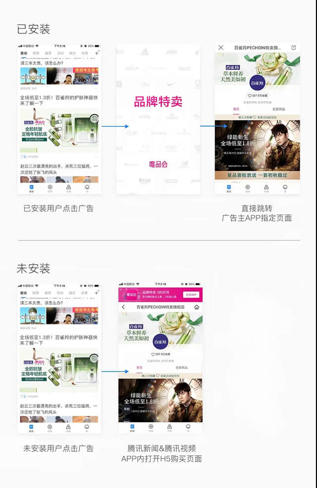优秀案例:唯品会善用直达新能力,助力ROI提升20% 唯品会使用腾讯新闻近期上线的双链直达、universal link等能力,实现安卓及iOS用户,无论是否有安装唯品会APP,都能以最短跳转路径到达指定购买页面, 使APP唤起率提升超过30%,整体ROI提升20%以上。