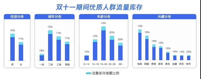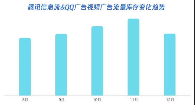 根据电商核心优质用户画像,信息流场景针对高转化(女性)、高消费力(25-35岁1-3线白领)、高兴趣值(电商、护肤彩妆等兴趣标签)匹配人群进行优先放量,保障用户体验的同时,提升效果转化。 流量优势: 信息流资讯场景话题内容丰富,适合通过类原生广告拉活。 QQ看点:18-39岁青壮年占7成,高兴趣值标签丰富; QQ浏览器:18-50岁消费中坚力量占8成,男性占6成,与京东、苏宁等广告主活跃用户人群匹配性高。 投放建议: 拉活广告主可重点增投; 广告主可以通过原生广告文案和素材,提高点击率(提高CPM,降低CPC),以达到跑量控本的目的。 2)视频流量再创新高 腾讯信息流与QQ广告的视频广告库存近10亿。在双十一大促期间,QQ看点与QQ浏览器视频流量进一步增加。