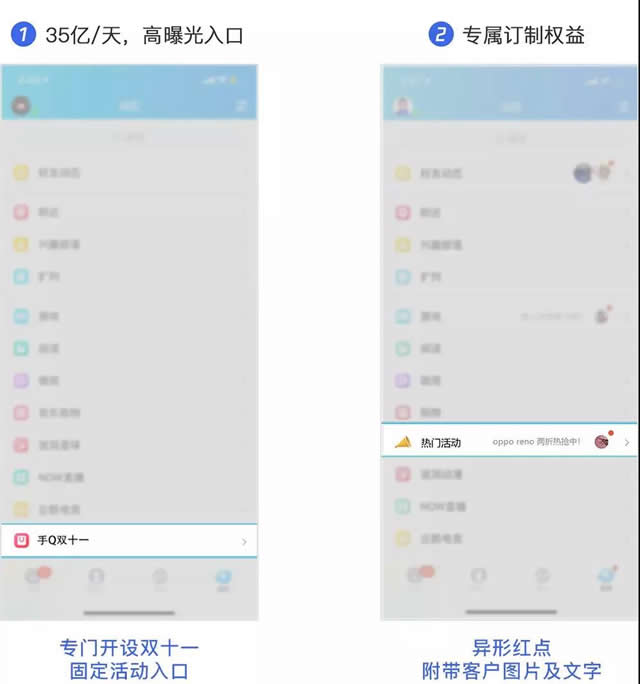 资源优势: 黄金资源聚合,实现强势曝光; 大促CPD方案性价比大幅提升,提前锁定优质流量,具体政策详询运营经理。 2、手Q双十一限时入口 手机QQ客户端为双十一首开限时入口,日均曝光高达到35亿。可定制专属权益,强用户提醒,为广告主高效引流。
