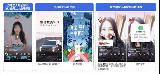 资源优势:双十一特供非标增量(竞价无法获取) 3、微视双十一带货方案 作为腾讯战略级产品,微视稳居短视频前列。双十一期间,当红明星柳岩领衔10大微视达人助阵微视双十一。开屏、精选页、热门页置顶、push消息、挂件、贴纸、搜索暗纹等全场景商业化合作,实现最大化用户触达。用户还可在视频中领取原生微信优惠券,完成从种草到拔草的最优转化链路。