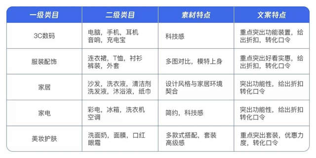 2、素材洞察 为备战双十一,我们整理了以往大促期间投放较好的品类及对应品类的素材、文案特点,协助大家进行选品拿量: