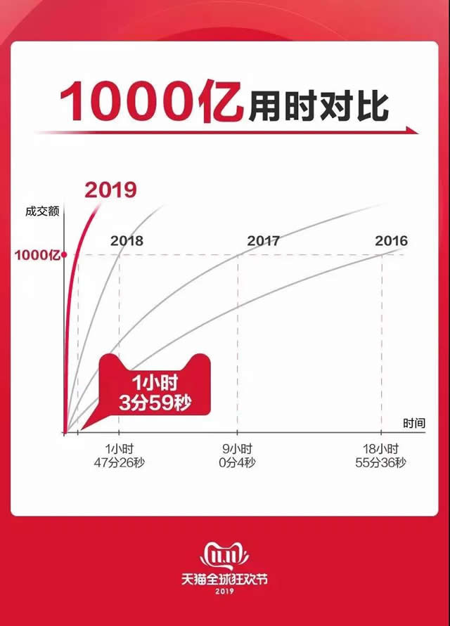 2019年11月11日,00时1宣传海报免费分36秒,天猫双11全球狂欢节成交额超过100亿元。 淘宝的“收银台”在叮叮当当地收钱响,而双十一的战绩汇报现场也是各大媒体的主战场,等待着一个又一个争分夺秒的奇迹产生。我们能看到大屏幕上的那些数字不停地在滚动,背后是淘宝上所有买家都在勾选着、结算着的“现场直播”。 1小时26分07秒,2019天猫双11成交额超1207亿元,已超过2016年双11全天成交额。而2018年,天猫双11用了8时08分52秒才达成这一目标。