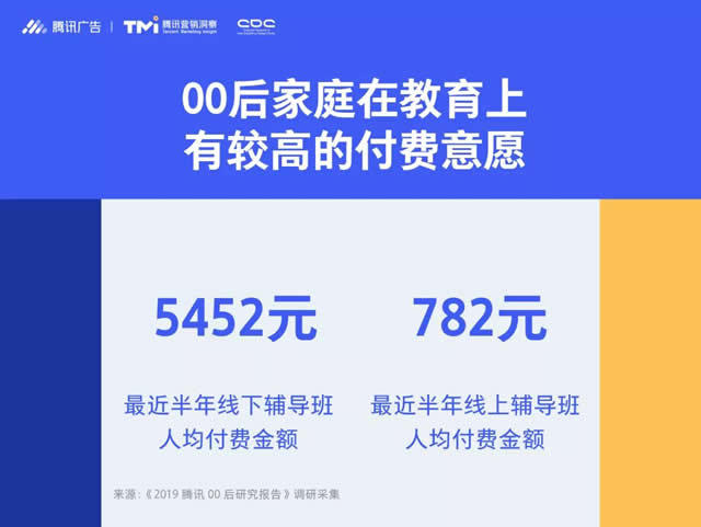 图片来源:腾讯广告 【市场下沉,把握机遇】 了解真正的市场机会点 重点行业:教育 市场下沉已变成众多企业的战略共识,如今,第一局的“圈地”已经结束,第二局下沉拉开了序幕。其中,教育行业竞争虽尤为激烈,但仍有较大的下沉空间。 根据《2019腾讯00后研究报告》,00后家庭的教育付费意愿较高。近半年,有超过50%的00后选择通过学科辅导班、兴趣班来提升学习能力、丰富自己的课余时间;00后学生在线下辅导班的人均花费为5452元,线上为782元。 相比生活在一二线城市的00后,在三四线城市成长的00后参与辅导班与兴趣班的比例较低。但调研发现,三四线城市的00后学生感知到的学习压力,约为一二线城市学生的两倍,他们拥有更强的学习能力提升动机。对于教育行业而言,下沉市场仍有进一步布局与沟通的空间。 与消费品行业相同,00后在辅导班的选择上也有较大的自主权。《报告》显示,00后自身的偏好是家长选择辅导班时最看重的因素。加强与00后学生本身的沟通,也会是教育行业持续获客的必经之路。