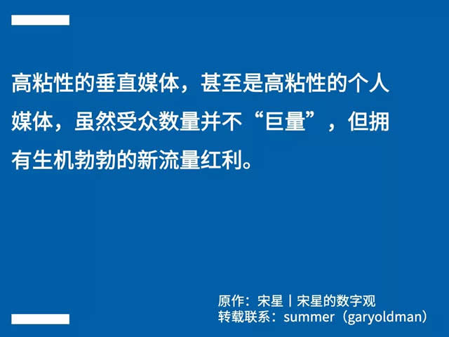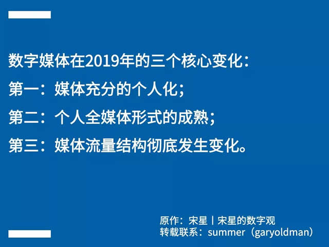 对于效果从业者,情况更加复杂,部分效果从业者受到的是“前后夹击”。 一方面,搜索作为最核心的效果类渠道的地位正在削弱,甚至整个搜索的生态都有崩溃的迹象,这使他们过去看似需求旺盛坚不可摧的搜索引擎优化的饭碗突然处于被翻覆的边缘。 另一方面,大量的优化工作都不再是靠“人海战术”,机器优化系统的不断渗入,导致对劳动力的数量要求大大降低了,对劳动力的策略和策划能力要求大大提升了。 在十一期之前的快递狂潮中,我们遇到了一个来自某丰的快递员,可能因为是快递的旺季临时支援写字楼的,所以我们此前并未见过他,于是随便跟他聊了几句。他看到我们做数字营销后很兴奋,说自己之前曾经在北京的某个SEM代理商工作过。我们都掩饰不住吃惊的表情。饭碗情况难道比我们想象中变化得更快? 饭碗这个事情,在接下来的若干年还会继续变化。一个加速变化的社会,一个更加加速变化的数字世界,一个更加疯狂加速变化的数字营销世界,不可能永远守着一个职位不变化。对于个人而言,如果没有含着金汤勺坐在矿山上出生,又应该如何应对? 媒体之变 数字媒体在2019年的三个核心变化 从广告主的视角看,媒体在2019年的变化也非常深刻。数字营销在进化的最初,皆是对标于传统平面和电视广告,但自2019年开始,数字营销的媒体和传统媒体已经毫无相似之处。 数字媒体开始发生剧烈的分化效应,即媒体本身的去中心化已经在这一年变得极为彻底。这显然直接改变了广告主的营销策略与运作,也改变了今天的数字营销的核心生态。 第一、媒体充分的个人化。与10年前写博客当站长的风潮不同,今天的个人化媒体状况十分充分且成熟。博客和个人站是少部分极客的潮流,并非万众参与。但今天人人都在各类平台上产出各种内容,都拥有一个唾手可得的自媒体小天地。万众皆如此,真正的菁英就会涌现,那些不可能从中心化的媒体中产生的菁英就一定会涌现出来。2019年,完完全全诠释了这一点。 第二、个人全媒体形式的成熟。过去的博客、个人站都是文字为主,而今天无论是短视频、直播、语音节目还是公众号,都是充分的全媒体的形式。个人同样可以非常专业,平台也帮助个人更加专业地应用多种媒体形式。 第三、媒体流量结构彻底发生变化。博客和个人站依靠搜索引擎的关键词排名获得流量,而今天的个人化媒体依靠社交和裂变获得流量,后者不依赖于一个中心化的搜索机制,因此具有更加旺盛的生命力。