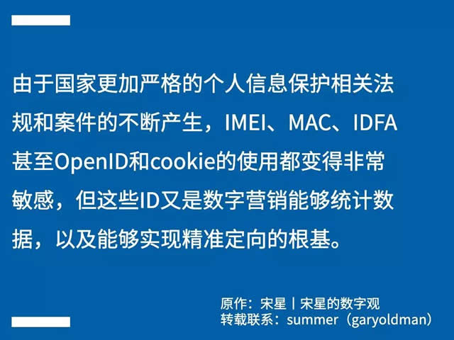 2019年尚未结束,但2019年的基调已然落地有声。 如果我们回望2019年,可能会觉得这是一个非常特殊的一年。在这一年,诞生了比过去任何一年都要多的概念说法和新鲜名词,“而又似乎没有什么真正新颖的东西”。在这一年,很多人的信心受到了打击,他们预言2019是过去十年里最糟糕的一年,同时也是未来十年中最好的一年。在这一年,行业里有很多迅猛快速的变化,也让广告主们都措手不及。 无论如何,2019年都值得纪念。 数据之变 数字营销可用的数据在收缩 2019年最大的一个变化是营销可用数据上的变化。这个变化如此之根本,在未来若干年后,营销的策略、方法和执行都会被它所改变。这一变化甚至可以用“颠覆”二字来形容。 变化来自于那些营销人过去认为天经地义可用的数据,在这一年,由于国家更加严格的个人信息保护相关法规和案件的不断产生,IMEI、MAC、IDFA甚至OpenID和cookie的使用都变得非常敏感,但这些ID又是数字营销能够统计数据,以及能够实现精准定向的根基。 你很难想象一个不能使用这些ID的数字营销世界,但如果真是如此,数字营销还有未来吗?是不是一夜又将回到石器时代,数字广告的投放跟报纸杂志的广告投放再无本质区别?