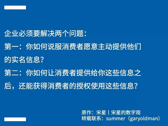 数字营销可用的数据在收缩 但现在一切都尚未尘埃落定,构建一个新的可供管理的个人信息保护和应用体系的是非常可能的,但这个体系一定会让用户有更大的数据决定权,企业由此必须改变自己的数字营销策略——从坐等数据,转变为主动寻求数据。 举一个例子。 过去企业可以通过硬件ID之间的一对一关系的匹配来打通消费者在不同营销触点上的数据,这一过程完全可以背着消费者进行。但2019年,这种方式即使还没有“入刑”,也变得非常灰色敏感。今天你仍然可以打通消费者的数据,但最现实的途径就是通过消费者主动提供他们的电话号码或者实名信息。 企业必须要解决两个问题,第一,你如何说服消费者愿意主动提供他们的实名信息?第二,你如何让消费者提供给你这些信息之后,还能获得消费者的授权使用这些信息?