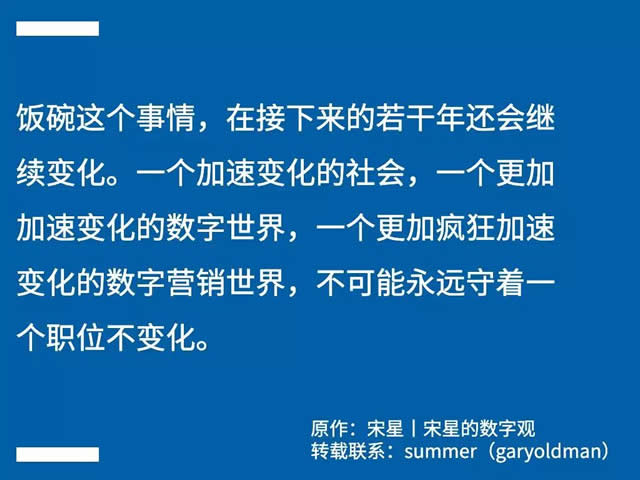 饭碗之变 2019年起,无论对品牌从业者,还是效果营销从业者都充满挑战。并且在可以预计的未来,这样的趋势都不可能发生改变。 品牌数字从业者的艰难元年 对于品牌从业者,有多种原因让他们感到“日子艰难”: (1)市场费用不再仅仅追逐品牌声量,更强调品牌渗透和转化; (2)营销运营化,广告只是营销的入口,而不再是营销的全部,而做好运营则需要重新构建新的经验、技术与知识体系; (3)不断多样化的数字媒体形态和多变的消费者兴趣热点; (4)有数据时候有挑战,没数据时候更挑战。 坊间流传好几个全球大品牌的公司都取消了CMO的职位,但有几个公司显然辟谣说并不是取消,只是暂时没有招来人。是不是谣传不重要,品牌从业者要开始攀登技能树的压力显然大大增加了。 效果从业者正被前后夹击