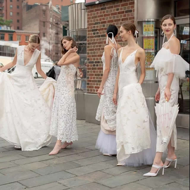 短款婚纱一般作为新娘的第二套“战袍”(reception dress)或派对礼服(after-party dress)出场。西式婚礼仪式后的晚宴或派对上,新人要领跳第一支舞,穿着短款礼服较为轻便易驾驭。2019 年的 mini dress 更是强调了这一舞裙属性,偏爱金属感、羽毛装饰和造型上的律动。 5、长短落差款 Extreme Highs and Lows