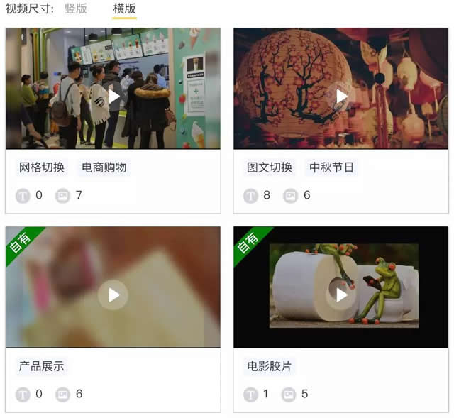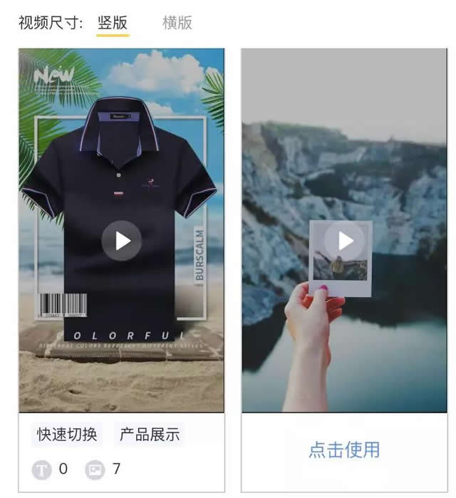 只需要修改图片和文字,即可快速实现所选中的效果。而且我们也根据投放平台的不同,提供了竖版和横版两种视频制作模式。