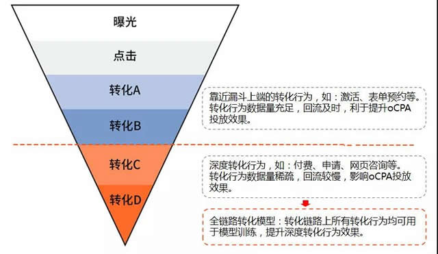 随着市场竞争激烈程度加剧,各行业广告主更加希望获取更高质量的深度转化用户,例如: 游戏行业广告主希望获取高质量的付费用户,金融广告主希望获取申请、授信成功的用户,教育广告主关注广告的网页咨询效果,资讯类App广告主希望提升用户留存率。 目前,oCPA为广告主提供基于投放目标和出价的效果自动优化,持续提高广告主的广告投放效率和投入产出比。 然而深度转化行为数据量稀疏,且数据回流较慢,不利于oCPA模型学习和广告效果优化。因此,oCPA升级上线全链路转化模型:将转化链路中,广告主上报的所有转化行为均用于模型训练,以提升oCPA广告深度转化行为效果。 oCPA推出全链路转化模型,显著提升深度转化行为效果 oCPA推出全链路转化模型:广告主上报的所有转化行为(激活、注册、付费、留存、表单预约、下单、咨询、申请等)均会用于模型训练,从而提升模型预估的准确性,提升oCPA广告深度转化行为效果。 通过实验对比,在全链路转化模型场景下,深度转化行为转化率提升35.28%↑,转化成本降低9.13%↓,转化量提升11.84%↑。