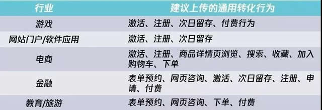 附:全链路转化行为上报方式 常见行业的通用转化行为举例如下,可供参考。 广告主可以上传表格中的通用转化行为,并根据所在行业特点,上传自己所关注的其他转化行为。上传的转化行为越多,越有助于广告效果获得更好提升。