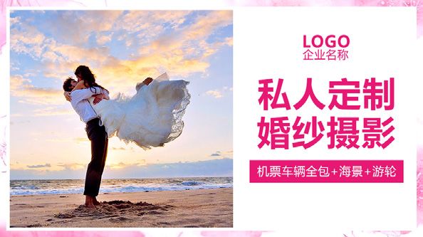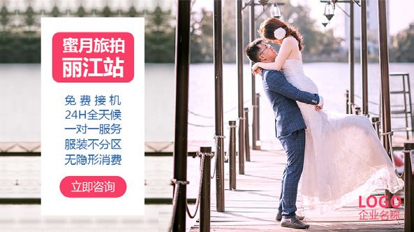 温馨Tips:素材中涉及到活动时间时,需在对应的时间点使用,如果没有在对应时间点进行推广该创意,则会被审核拒绝。 婚庆服务类 与婚恋交友的广告画面有所不同,婚庆服务的广告在图片的选择上更倾向于对素材质感的追求和画面情感的传递。 • 针对拍摄环境的宣传画面可分为内外景,内景以精致为主,注重细节。外景空间大,以景衬人。还有最为流行的旅拍,在图片的选择上需彰显灵活性大、景点选择多的特点。