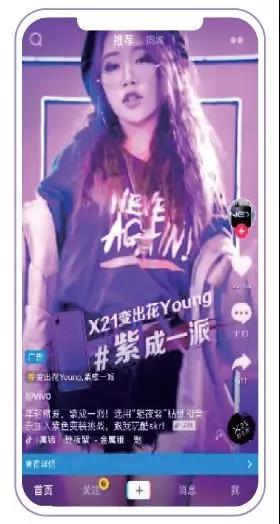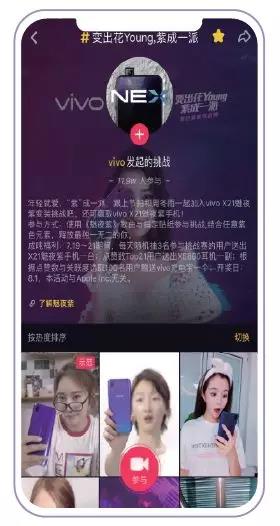 Upgrade:借力AI内容经营力,制造品牌超感体验 人工智能技术带来了新的革命,这为短视频平台带来了助力。对于具有技术优势的抖音来说,借助AI打磨自身产品的同时,也不断开发适用于营销的技术产品,激发更多创意表达的内容互动方式,比如创意定制贴纸、BGM创作互动等新技术和新体验,通过场景化植入,为用户提供更丰富的互动形式,既提高了用户体验,又驱动用户参与创作,进而为品牌合作提供了更多创新营销想象力。 vivo X21魅夜紫新配色上市,为了吸引年轻人的关注,借助抖音AI+彩妆技术,打造了一场好玩炫酷紫色party,释放彩妆魅力,通过人脸识别精准3D上妆,实现前后变装体验,让用户在互动体验中深刻直观的感受vivo魅夜紫的独特魅力与产品卖点,成功惊艳到目标用户。