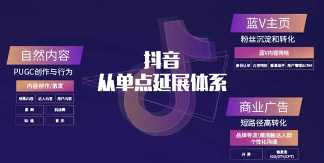 为推动IP衍生,2018年备受年轻人喜爱的“抖音美好奇妙夜”将在全球范围内落地。同时,通过iDou之夜、明星PD计划、音乐专辑“听见·看见”的发布,抖音将唤醒平台内全球明星、达人的能量价值,打造更多优质IP。 为实现音乐扶持,抖音将推出看见音乐计划、音乐发布、快闪店、iDou School音乐打榜节目、麦田音乐节等项目,为更多有才华的音乐人提供机会和资源。 为实现垂类深耕,抖音还特别推出多元用户圈层计划,满足时尚、艺术、动漫等不同圈层用户的深度内容需求。 从单点延展到体系,抖音贯通三大流量矩阵 面对用户消费内容不断细分的变化,抖音正在打破过往营销套路,与品牌方、内容方、用户方多方合力,共同打造持续健康的营销生态。 据抖音营销全国负责人介绍:“2019年,抖音营销平台将从单点延展到体系,通过三大流量矩阵助力品牌营销。PUGC产生的自然内容、企业蓝V主页展现的品牌内容以及个性化投放的商业广告三大矩阵将共同支撑起抖音营销平台,满足用户互动、粉丝沉淀、品牌导流等多元营销诉求。”而抖音所引领的身份扩展、形态融合、行为缩短、场景无限等四重趋向,正不断打破品牌营销者的传统观念,成为面向新消费时代和新基础设施的核心营销平台。