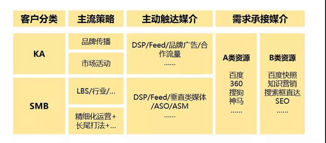 我们对媒介矩阵的探索也是基于企业的获客成交模式,很多ToB企业的大客户贡献80%甚至90%的利润,属于强Sales Driven(销售驱动),有些企业的大客户的贡献60%-70%利润,这时候中小微企业的价值就更突出了,媒介拉新就占据了更加重要的地位。因此,媒介投放作为重要的获客手段。很多情况下也会有意识无意识的被拆分成大客户线索获取以及中小微企业线索获取。 因为这是两种不同的线索流转路径,根据业务的特点,所以初期的思考是把布局的探索针对大客户和中小微客户的拉新方向,也就是类比ToB+ToC两种拉新方向。 ToB:大客户获客模式是重线下销售轻媒介投放,媒介更多是进行品牌宣传触达目标企业以及配合线下的活动进行拉新。 ToC:中小微获客对于媒介有了更大的空间,且针对中小微企业的决策路径会更容易达成,可以直接尝试在线上进行拉新和转化。比如最近今日头条出现概率很高的ToB拉新广告,也代表很多企业意识到了这一个突破点。 三、ToB企业的媒介矩阵应该符合哪些需求 因为单纯的B端和C端企业,在产品、服务以及变现流程+模式上巨大的差异,所以在媒介选择时,要求和限制更多。 经过几个月的思考和学习,总结了4个类似问题需要进行深入的思考: 1、产品最核心的业务特点和商业模式是什么? 2、核心目标企业是大客户还是中小企业?针对性的企业的痛点和产品业务的价值点是什么? 3、企业的目标用户画像是什么样的?如何利用抓住企业的Key Person(关键决策人)? 4、KP的决策流程是怎样的?如何利用媒介能够更有针对性的影响决策人的关键决策路径? 这4个问题很重要,但对很多处于初创期和成长期的B端企业,没那么容易给出4个问题清楚的答案,也就没有办法直接给出标准的媒介矩阵搭建方案。 而相对成熟的企业,比如ToB领域国际行业的巨头SAP、Oracle、Salesforce等企业,核心产品和业务主要针对KA企业,是很重的Sales Driven模式,也针对目标行业进行了很精细的拆分。对于他们来说,已经沉淀下来清晰而且稳定的媒介矩阵,主要目的是配合销售的目标,进行品牌宣传和线索获取。 而对于国内处于发展初期的ToB企业,没有那么成熟的产品和解决方案。国内背书和用户量比较大的钉钉、阿里云初期通过了大量的宣传和运营活动,逐渐积累了可观的客户,是业内很有价值的参考对象。接下来,尝试根据目前服务企业的特点,输出现阶段的媒介矩阵搭建思路。 四、媒介的筛选标准和效果判断 终于到了媒介的选择和判断的部分,但这部分也是根据不同企业的业务现状、媒介投放现状,有很大差异。也正因为没有标准的媒介矩阵方案,可以进行很多有意思的思考和探索。 有了前面相对清晰的4个问题的答案,以及针对B端企业ToB+ToC媒介矩阵的方向,针对两种拉新方法,初步选择为搜索媒介、展示类广告媒介、垂直类媒介、合作流量媒介,这里面包括了付费和非付费的媒介(更细分的媒介选择暂时没有展开)。