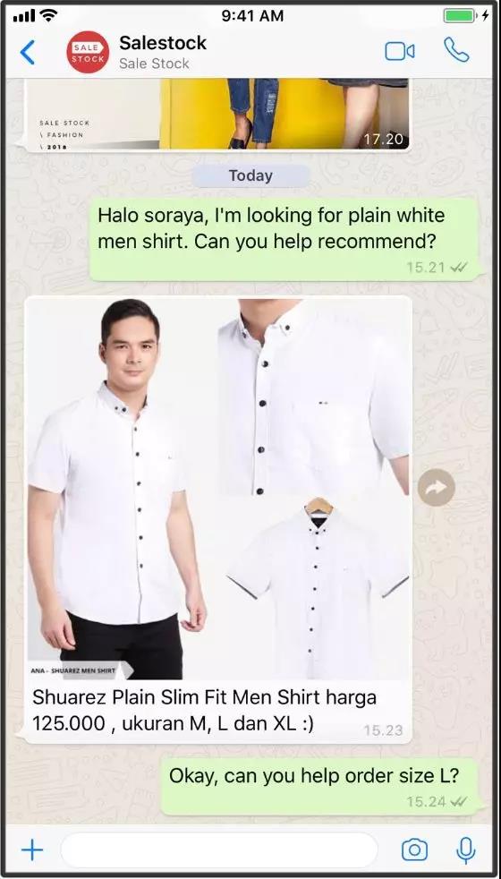 在这款即时通讯 App WhatsApp 于去年 1 月发布了其官方 WhatsApp Business App 后,预计会有更多印尼本地企业使用该平台与用户进行沟通。此外,通过与 Facebook 和 Instagram 两大平台的整合,用户可以直接通过 WhatsApp 向企业发送查询信息,而这有助于营销人员发现高潜在用户。 然而目前,这款 App 仅推出了 Android 版本,且只在印度尼西亚、意大利、墨西哥、英国和美国推出,旨在帮助小型企业在 WhatsApp 平台建立官方账号。尽管如此,印度尼西亚的公司已经通过这款 App 盈利。 优秀案例:仅在推出的 1 年时间内,就已经有品牌很好地利用上了这项服务。Sale Stock 利用 WhatsApp Business 吸引消费者,及时回应他们的需求,从而向其自己的电商网站引了大量入站流量。