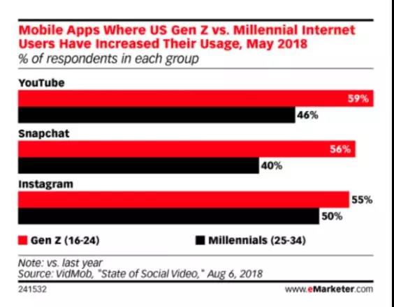 4. YouTube 70%的观看次数在移动设备上,娱乐和信息已经超越了电视。不过,YouTube的大部分价值在于其便携性。 5. YouTube是2018年的顶级iOS应用程序。根据Apple的说法,YouTube从2017年的第三位上升到2018年的第一位。它击败了Snapchat和Facebook,成为今年下载次数最多的免费应用程序。据Statista称,与此同时,YouTube在Android上排名第三。 6. 59%的Gen Zers去年增加了他们的YouTube使用量。16到24岁的人说他们越来越多地使用YouTube,Snapchat和Instagram(按此顺序)。与此同时,46%的千禧一代正在增加使用量。如果你想知道用哪个社交网络来接触孩子,那么YouTube可能就是你的选择。