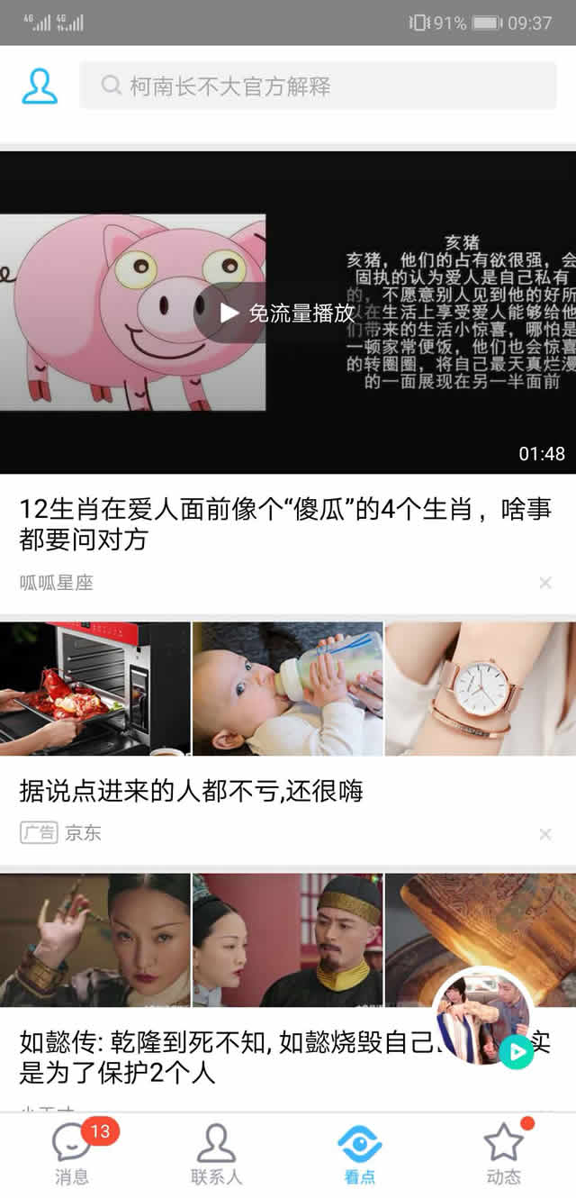 朋友跟我说过这么一句话:年轻的人玩QQ,年纪老的玩微信(小编默默地在心里庆幸,我还玩QQ的,我还是个年轻人)。 在QQ有一个页面是QQ看点,在QQ看点里面也会有信息流广告,QQ看点信息流广告是在第七顺位。很多广告主会问,QQ看点会不会有人看?会不会产生点击? 当然会,毕竟QQ的用户可是超10亿!使用QQ的用户都比较年轻化!大多是95后,00后,现在的年轻人最大的优势就是钱多(学生比上班族有钱,大街上随意一个学生都是iPhone X),所以如果我们的推广产品的针对用户是年轻用户,推广产品又是一些新鲜事物,那么选择QQ看点信息流广告一定是没错了。 现在女生关注较多的是星座,测试,小说,最新火热的《电视剧》等等,QQ看点里就是这些星座,测试,小说,最新火热的《电视剧》等品类相关的文章,如果是对这些感兴趣的用户能够一直看到这些问题,小编平时都会翻一翻,然后一翻就是10分钟过去了。因为推荐的内容都是根据用户的浏览兴趣,所以很容易沉迷。 今天小编在QQ看点里看到的广告是京东的。