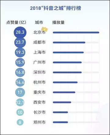 ▲ 截取自《2018抖音大数据报告》 而据2018年抖音发布的《短视频与城市形象研究白皮书》显示,重庆、西安、成都被更多网友好奇与喜爱。虽然抖音与其中多个城市达成合作,给予相应的推广资源支持,但城市自身的魅力也起着重要作用。这些城市没有一线城市的快节奏和高压,比四五线城市的基础设施完善,人们对市井街头充满烟火气息的生活方式饱含期待。