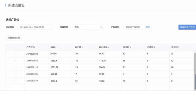 在新建流量包界面里,可以根据统计时间、投放目的、广告计划的筛选维度,查询到不同场景下的资源位投放情况。设定筛选条件之后,对应的广告位就会出现在界面下方。 穿山甲从消耗、激活、注册、次留、付费等多个维度,对广告主的每一条投放的广告位进行了具体的数据反馈。借此,广告主可以判断每个广告位是否符合转化目标,并进一步制定个性化的调整优化方案。