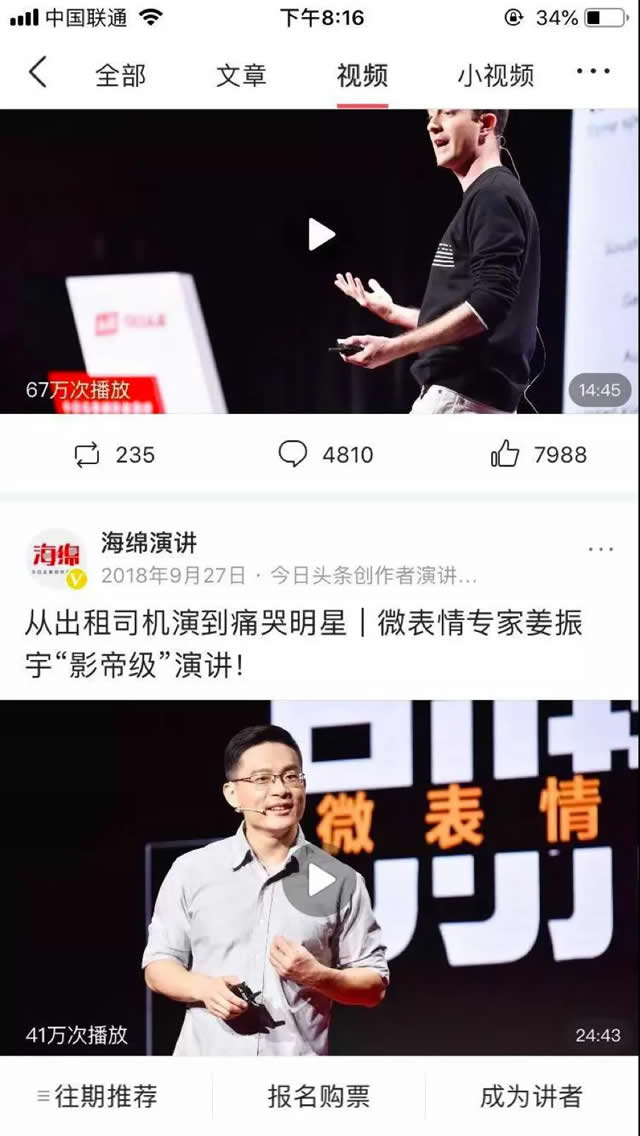 三、营销价值: 头条系全域用户精准沟通 除了给今日头条品牌加分,海绵演讲对金主们的营销价值也是显而易见的——人群优质、流量庞大、投放精准。 首先,凭借今日头条强大的资源整合力,海绵演讲不仅能邀请到站内成长起来的优质创作者,也能邀请到世界级经济学教授、全球畅销书《怪诞行为学》的作者丹·艾瑞里,大众明星吴克群等重磅级人物成为今日头条的创作者。 每一个演讲者,在自身领域,既是优质内容的创作者,也是自带流量的传播者。 其次,演讲当天西瓜视频、火山小视频、YY、优酷、虎牙、斗鱼等内外部多平台联动直播。
