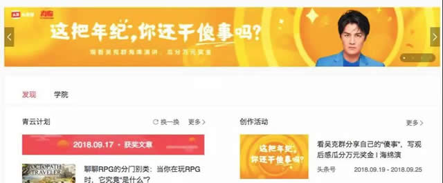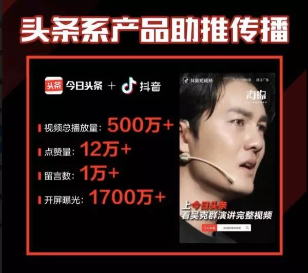 不同的演讲者,还会因人而异的配备资源,像吴克群的演讲,还有今日头条、抖音开屏,以及在头条系所有产品展开征文活动。